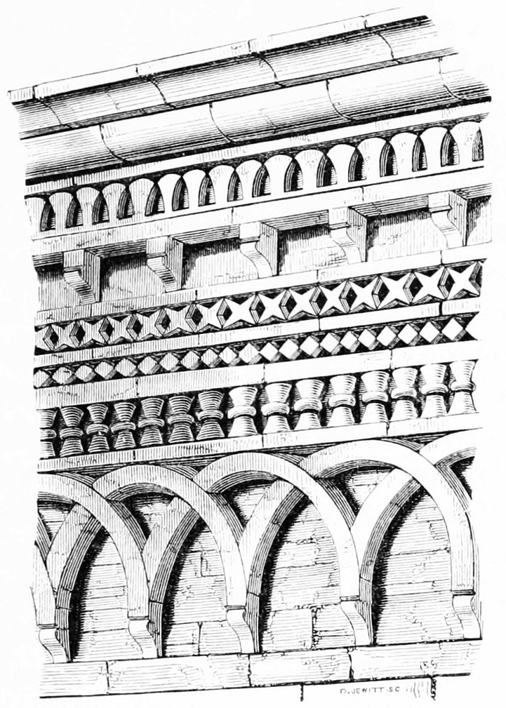 [52] I say “usual,” because it is really quite curious to see how repeatedly either the dog-tooth or the nail-head is used in this position. The commonest eaves-cornice consists of a simple chamfered stone—the chamfer covered with dog-tooth—supported on moulded corbels at short interval.