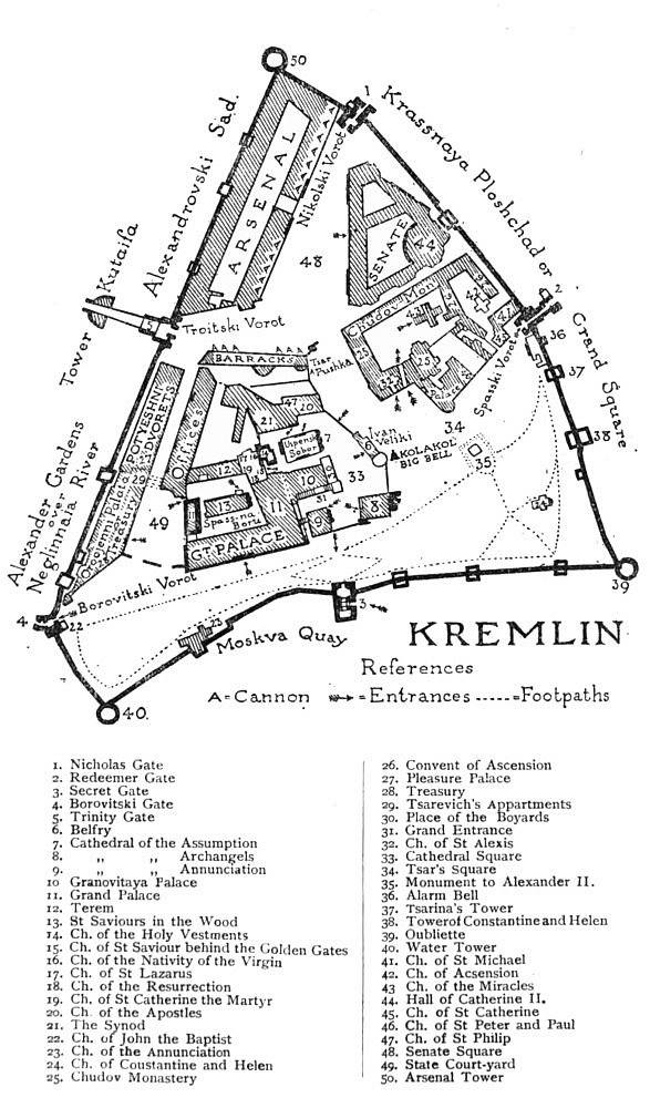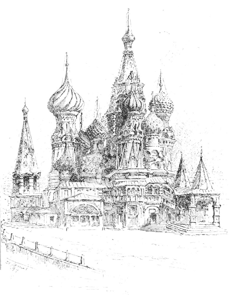 For the rest, my task has been easy: I have had but to examine, compare, and judge the work of others and from their stored treasures make my selection. I have produced little that is really original: others have delved amid ruins for vestiges of the earlier Moscow; have unearthed ancient monuments; transcribed illegible manuscripts; ransacked archives, measured walls, calculated heights, weighed bells and counted steps; formed theories and found evidence to support them; so have rendered my labour light and pleasant. I regret that I, who at best am but an intelligible interpreter, cannot acknowledge more particularly the hundred and more authorities from whom I have drawn; in the same inadequate, general fashion I must thank many friends, English and Russian, for the kindly interest they have taken in the work and the intelligent assistance they have rendered me in its compilation. For direction to valuable sources of information, and other services, I am conscious of particular indebtedness to the Rev. F. Wyberg, of the English Church, Moscow, and to Mr V. E. Marsden, the correspondent of the Standard there—either of whom might have written a much better book about the town they know so well. The object of this volume I shall consider to be achieved if its perusal gives to anyone pleasure equal to that its compilation has brought me; or awakens even a few readers to a greater interest in Moscow, and a better understanding of the Russian people.