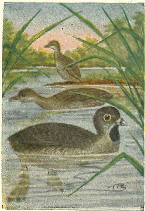 GREBES; Colymbidæ:—Form, duck-like; bill pointed and never flattened; no tail; legs at extreme end of body; each flattened toe with an individual web; wings small. Flies rapidly, but patters along the water before taking wing. Expert divers, using wings as well as feet, to propel them, under water.