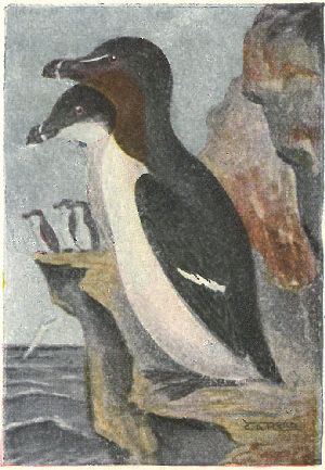 AUKS, MURRES, PUFFINS. Family Alcidæ:—Bills very variable; tail short; usually takes flight when alarmed, instead of diving as do grebes and loons. With the exception of puffins, which stand on their feet, all birds of this order sit upon their whole leg and tail. They are awkward on land; some can hardly walk.
