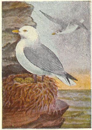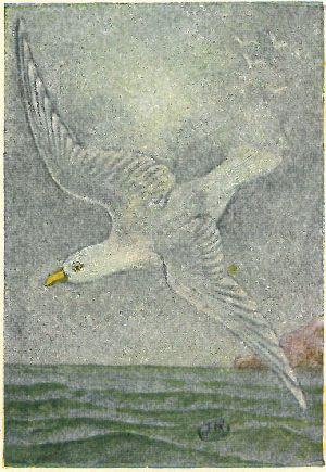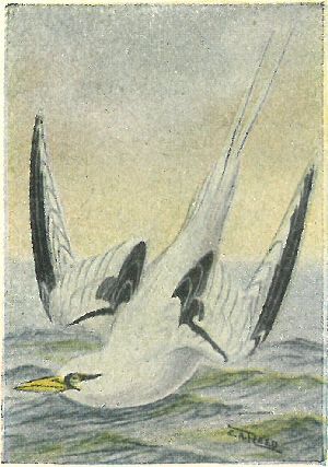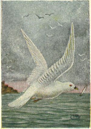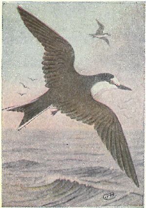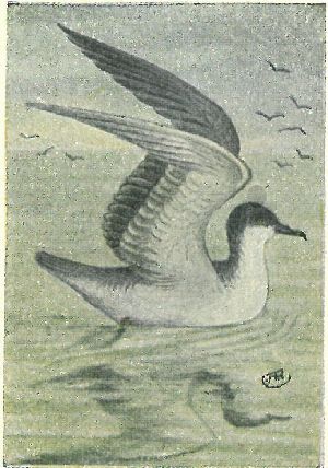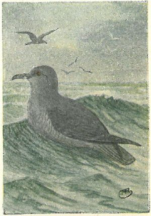 FULMARS, SHEARWATERS, PETRELS. Family Procellariidæ:—Nostrils opening in a tube on top of the hooked bill. Plumage of fulmars, gull-like; shearwaters [11] entirely sooty black, or white below; petrels blackish, with white rumps,—very small birds. All seabirds.