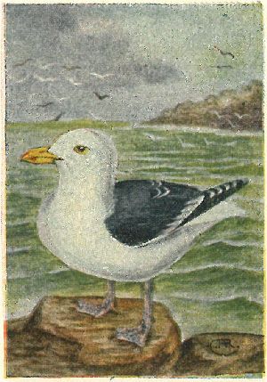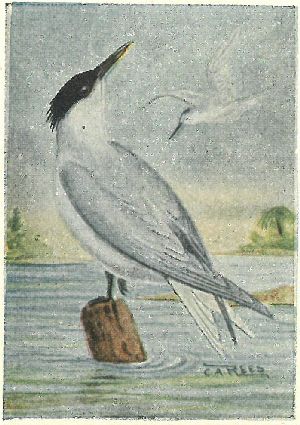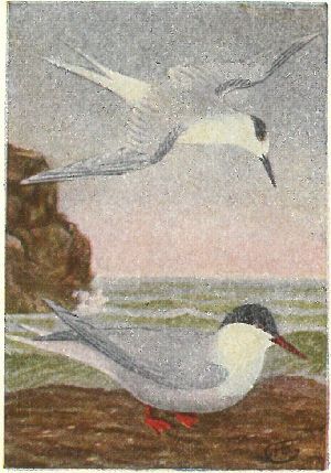 GULLS, TERNS. Family Laridæ:—Gulls have hooked bills, usually yellowish, yellow eyes and pale, webbed feet. Heap, underparts and square tail are white in adults; back, pearl-grey; exceptions are the four small black-headed gulls, which also have reddish legs. Gulls fly with the bill straight in front, and often rest on the water. Terns have forked tails, black caps, and their slender, pointed bills and small webbed feet are usually red. They fly with bill pointed down, and dive upon their prey.