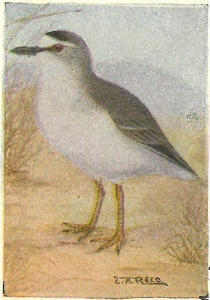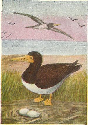 Nest.—Sometimes built of sticks, and sometimes simply a hollow in the sand or bank under overhanging bushes, usually on an island. The 2 eggs are brownish with a few black specks (3.50 × 2.25).