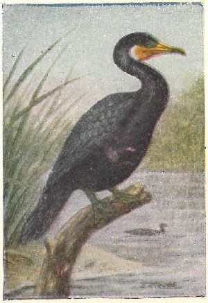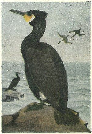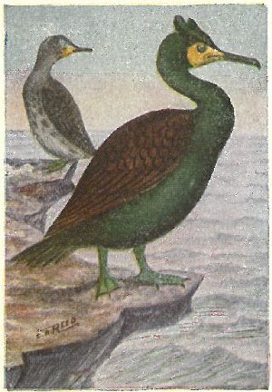 CORMORANTS. Family Phalacrocoracidæ:—Bill slender, but hooked at the tip; plumage glossy black and brown; eyes green. They use their wings as well as feet when pursuing fish under water.