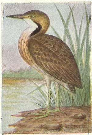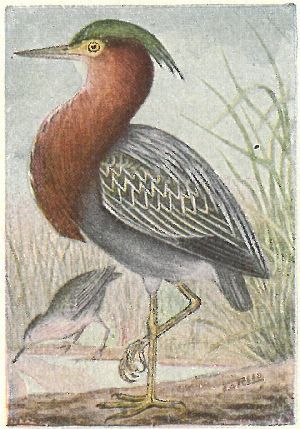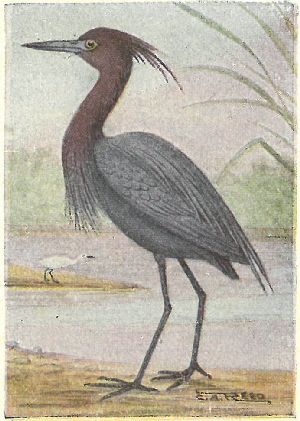 HERONS, BITTERNS, EGRETS. Family Ardeidæ:—Bill long, straight and pointed; head usually crested, and back often with plumes. Herons fly with a fold in the neck, and the back of the head resting against the shoulders.