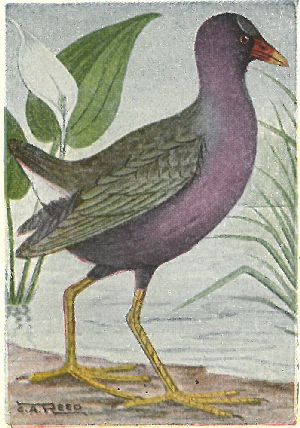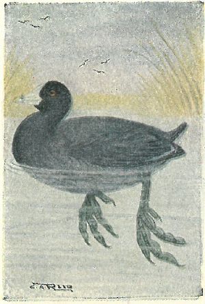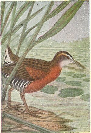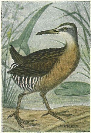 RAILS, ETC. Family Rallidæ:—Bills are variable, but toes and legs long; wings short; flight slow and wavering; marsh skulkers, hiding in rushes. Gallinules have a frontal shield on the forehead, Coots have lobate-webbed feet, short, whitish bills.