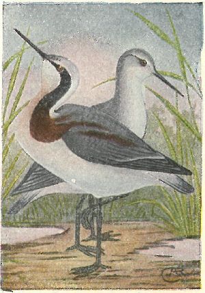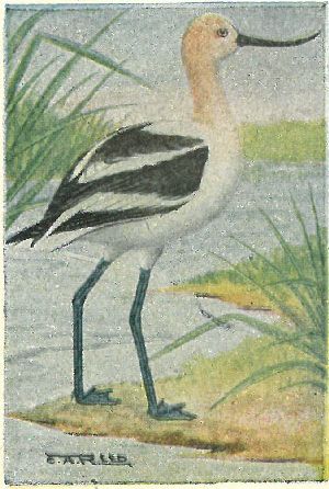 AVOCETS, STILTS. Recurvirostridæ:—Avocet, with slender recurved bill, and webbed feet; stilt, with straight bill, very long legs, toes not webbed.