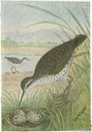 Nest.—A depression in the sand or ground, not more than a foot or two from the water’s edge, so they can slide from their two eggs into their natural element. The eggs, which are laid in June, are olive-brown, specked with black (2.90 × 1.75).