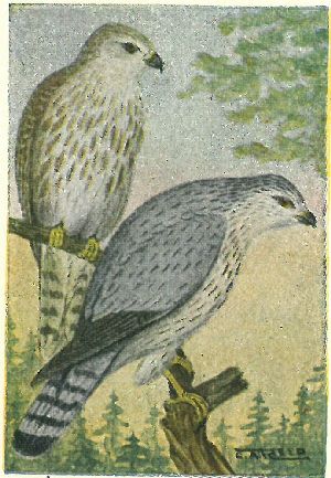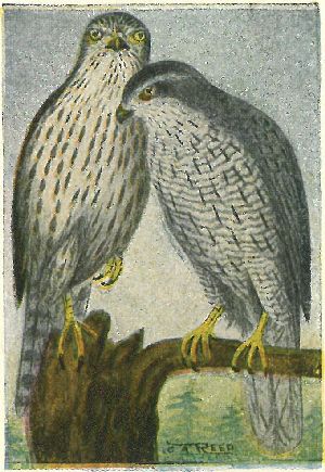 Black moustache mark, or patch on each side of the throat. Adults white below, tinged with buffy on the breast and sides, and lightly barred with black; above bluish slate, darkest on the crown. Some adults are darker, and much more heavily barred than others. Young, brownish black with rusty edges to the feathers; below, buffy, heavily streaked with blackish. This is one of the handsomest and most dashing of the raptores, and is very similar to the one formerly most used for the chase in England. They are swift and fearless in pursuit of their prey, and the fastest flying ducks as well as the slower herons fall easy victims to their valor. Their feet are exceptionally large, and they are often, on this account, known as Great-footed Hawks.
