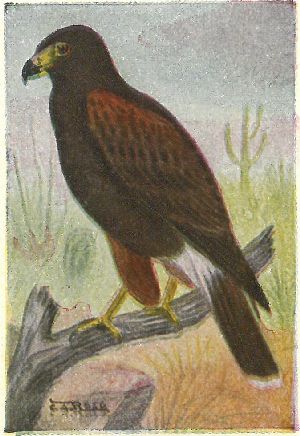 Legs feathered to the toes. Adults with back, shoulders, thighs and legs, rusty, barred or streaked with black; tail grayish-white, tinged with rusty. Young birds are brownish-black, above and without any rusty below. In the dark phase they are sooty-brown, more or less varied with rusty, and the tail is the same as in the light plumage. Their bill is larger and tail longer than that of the last species. A fairly abundant hawk on the plains and prairies west of the Miss., usually not at a great distance from water.
