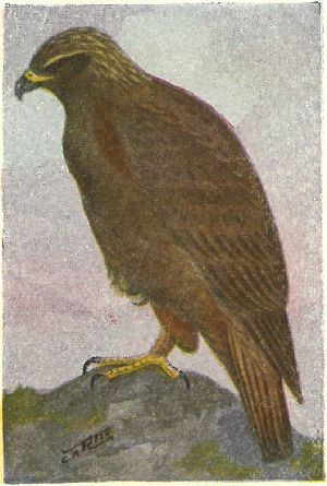 Legs feathered to the toes. Plumage blackish-brown, adults having the lengthened feathers on the nape, golden-brown, and the tail more or less mixed with white; leg feathers rusty. These large, handsome, well-built birds of prey are fairly abundant in thinly settled country west of the Miss., especially in mountains and foot-hills. They are very powerful birds and a single pair of them will rule the whole country in which they reside. They are very shy in the presence of man and will never attack a person or show fight unless wounded or surprised at their meals. Their food consist of prairie dogs, rodents, ducks and even fawns.