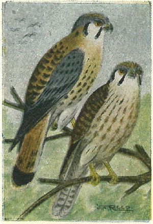 This is the smallest and one of the handsomest of our hawks. Cannot be mistaken for any other species, because of its bright colors and odd marking. The female is barred on the back, wings and tail, while the male has but a few short bars on the back. The general tone of both, above, is a bright rusty-brown. This is the most abundant hawk that we have, and it is also best known, chiefly because it is found commonly in the vicinity of farmhouses and commonly on the outskirts of cities. Their flight is peculiar, a few rapid wing beats, then a short sail, alternately. They are very noisy in mating season and when the young birds first fly, their notes being a rapidly repeated, “killy-killy-killy.” Their food is of grasshoppers, mice and rarely small birds.