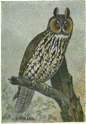 Ear tufts very short; general color buffy, not nearly as brown nor as dark as the last species usually is. They are not nearly as nocturnal as most of the owls, and most of their hunting is done about dusk, when they may be seen flying close to the ground over marshes or low land. Their flight is perfectly silent, which aids them in securing their prey of field mice, which they usually get without stopping in their flight, just swooping down, extending their long legs, armed with wicked little claws, and it is all over with the little rodent, he being carried to a nearby stump, and devoured, fur, bones and all.