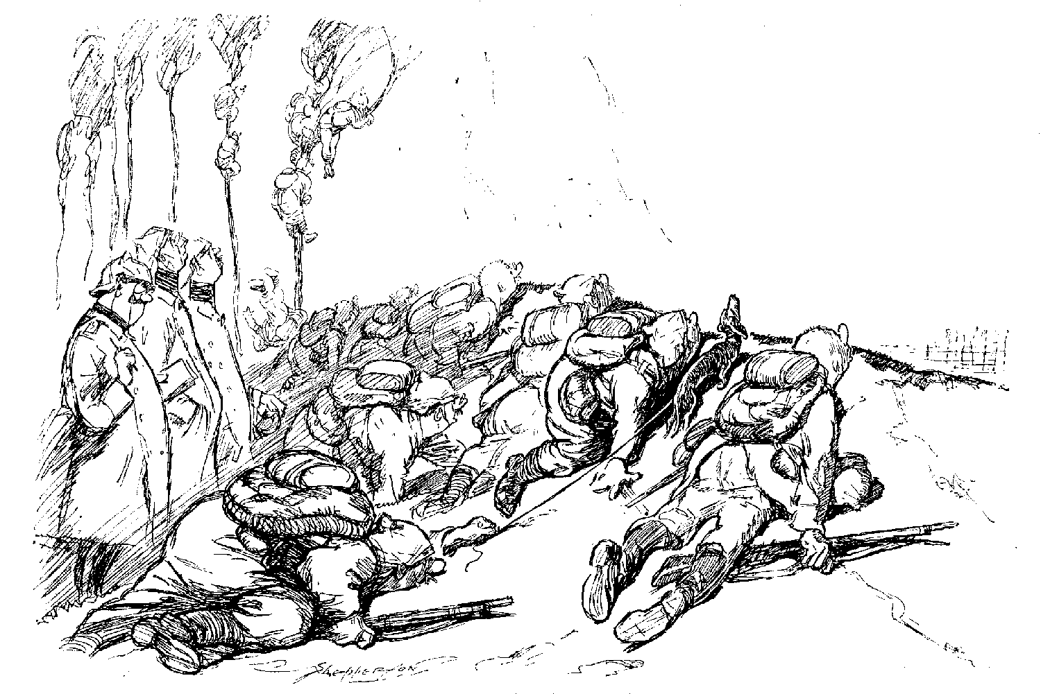 Tommy (to his pal in middle of charge). "Look out, Bill. Your bootlace is undone!"
