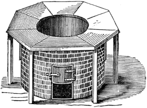This stage of the operation is a wet one requiring an open boiler surrounded by planks, which slope towards the centre, called a battery, Fig. 4, suitable for six or eight men to work at. Each man is provided with a rolling-pin, cloths, brushes, &c. The soft and tender hat is laid upon one of these planks or benches, wrapped in a damp cloth, and carefully wetted, squeezed, folded, rolled and unrolled, keeping it constantly moistened by dipping it in the hot water of the[42] boiler, folding and unfolding with every variety of crossings, rolling it as a scroll, pressing, shaking, dipping and rolling it again and again, the hatter all the while bending over his work in front of the almost boiling caldron, and surrounded by steam. He labors hard, ever changing the position of the hat under his hands, so as to make it an evenly felted and perfect piece of work, which these oft-repeated motions ultimately accomplish.