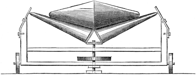 It will not have escaped observation that this ingenious piece of machinery is applicable only for fur, the filaments of which are short and less inclined to tangle than those of wool, but another and no less useful piece of mechanism has been invented for forming the bodies of wool hats, and like the other has entirely superseded the use of the bow in all large factories where wool hats are made. It consists of a modified common carding machine, the sliver from which is conducted to a set of double conical blocks that are placed base to base, and which slowly revolve upon their axes in front of the carding machine, and the sliver is received and wound upon these combined blocks to the required thickness, sufficient for one hat, both blocks being covered at the same time. This machine which carries the blocks has a horizontal vibratory motion, or swaying backwards and forwards, that enables the sliver to[60] be wound in a systematic manner on the cones, with a varied thickness of material for brims and crowns, and causing also the fibres of the wool to lie in a diagonal position, as layer upon layer covers the blocks. The bodies of the two hats, each of a conical figure, are thus made over the surface of a double cone which are separated by cutting them along their middle or base line, and slipping them off at the end. They are now ready to be wetted, shrunk, and felted in the usual manner by the regular hatter.