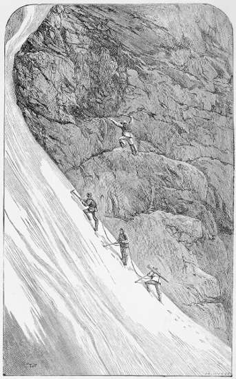 Bounding the snow-slope to the left was the ridge along which travellers to Courmayeur usually descend. It is rough, but absolutely without danger. The party were, however, tired when they reached this place, and to avoid the roughness of the ridge they took to the snow. The inclination of the slope above was moderate; it steepened considerably lower down, but its steepest portion did not much exceed forty-five degrees of inclination. At all events, a skilful[21] mountaineer might throw himself prostrate on the slope with perfect reliance on his power to arrest his downward motion.