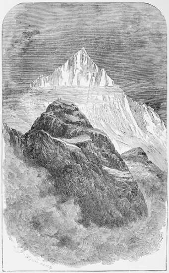 We then turned our eyes on the rocks to our right, which seemed practicable, though very steep; we swerved towards them, and worked laboriously upwards for three-quarters of an hour. Mr. Hawkins and the two guides then turned to the left, and regained the snow, leaving me among the crags. They had steps to cut, while I had none, and, consequently, I got rapidly above them. The work becomes ever harder, and rest is unattainable, for there is no resting-place. At every brow I pause; legs and breast are laid against the rough rock, so as to lessen by their friction the strain upon the arms, which are stretched to grasp some protuberance above. Thus I rest, and thus I learn that three days’ training is not sufficient to dislodge London from one’s lungs. Meanwhile my companions are mounting monotonously along the snow. Lauener[11] looks up at me at intervals, and I can clearly mark the expression of his countenance; it is quite spiritless, while that of his companion bears the print of absolute dismay. Three hours have passed and the summit is not sensibly nearer. The men halt and converse together. Lauener at length calls out to me, ‘I think it is impossible.’ The effect of Ulrich’s prediction appears to be cropping out; we expostulate, however, and they move on. After some time they halt again, and reiterate their opinion that the thing cannot be done. They direct our attention to the top of the barrier; light clouds scud swiftly over it, and snow-dust is scattered in the air. There is storm on the heights, which our guides affirm has turned the day against us. I cast about in my mind to meet the difficulty, and enquire whether we might not send one of them back with the theodolite, and thus so lighten our burdens as to be able to proceed. Kaufmann volunteers to take back the theodolite; but this does not seem to please Lauener. There is a pause and hesitation. I remonstrate, while Hawkins calls out ‘Forward!’ Lauener once more doggedly strikes his axe into the snow, and resumes the ascent.