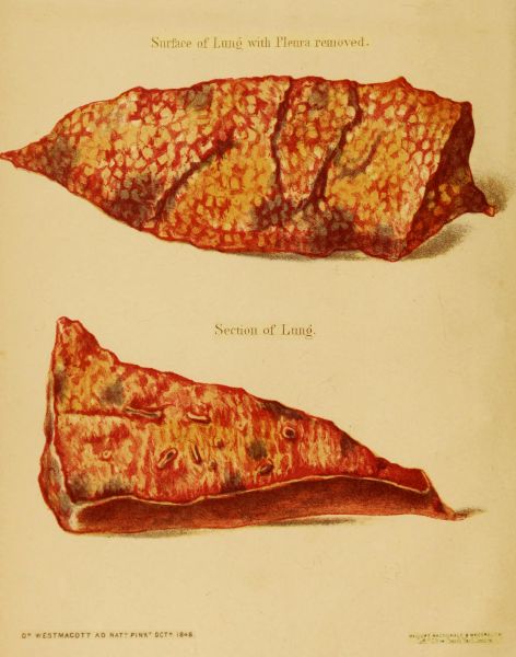 Post-mortem appearances. The wound in the left leg opened directly into the brachial vein, which was filled with lymph and a thin pus for a very short distance, both above and below the external opening; immediately above this, the vein was healthy, nor was there any appearance of disease in any of the other veins of the limb, nor in the veins leading to the heart. The glands in the axilla were swollen. The lungs were found studded irregularly in different parts, with circumscribed spots of livid congestion: these existed both upon the surface and in the substance of the lungs; they were generally about the size of a filbert, but in some places they occupied a single lobule, and were accurately circumscribed by its outline.