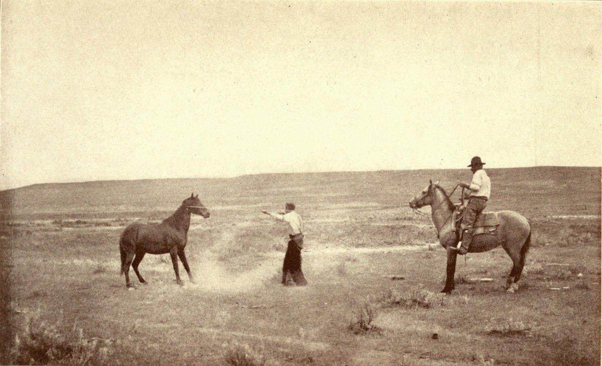 Soon after dark, wagons began to drive up to the schoolhouse and to unload their freight of laughing, chattering people, excited by the prospect of the dance; and a little later the frequent pounding of quick galloping hoofs told that the cowboys were gathering. Before long the rail to which the horses were tied was crowded from end to end, while their riders gathered on either side of the door, squatted on the ground and smoked their pipes and cigarettes and discussed the events of the range—the calf crop, the incidents of the round-ups, and the piece of beef.