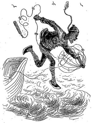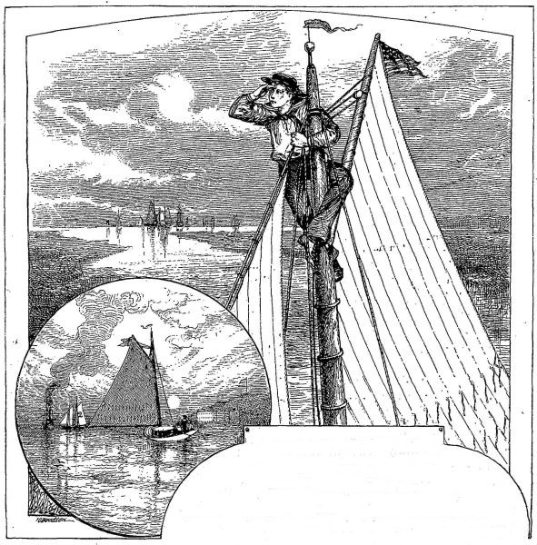 The boys were glad when they passed out of the East River, and by way of Buttermilk Channel reached the bay, where by skirting the Long Island shore they were out of the track of steamers and other craft. They had a delightful sail through the Narrows and down the broad outer bay, where there was a long gentle swell that gave the boat a just perceptible roll. About four o'clock they reached the mouth of the little creek which separates Coney Island from Long Island, and found it so narrow and shallow that they began to think it was not navigable for anything larger than a row-boat. Charley allowed[Pg 451] the boat to run her bow gently against the shore, and told Joe to keep her from drifting off while he climbed up the mast hoops to see how the land and water lay.