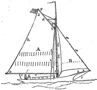 b b, the bowsprit, which supports the mainmast by means of the jibstay (s s), which leads to the mainmast head, and on which the jib (B) is hoisted.