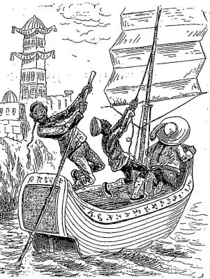 The colored men were strong and amiable, and they lifted out the mast with perfect ease, and refused any payment. Laying the mast along the deck, the boys went on board the Ghost, and getting out the oars, rowed her a little way up the creek, and made her fast for the night by carrying the anchor ashore and planting it in a field.