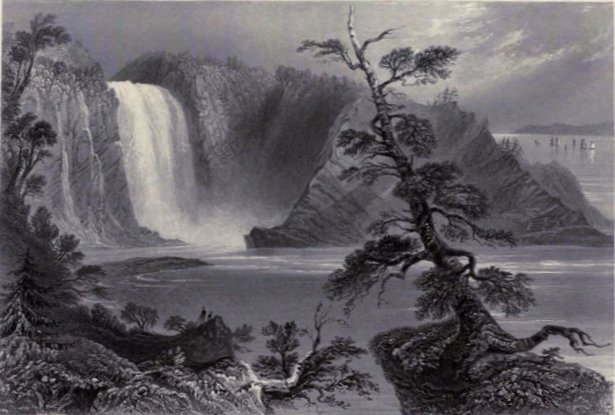 “The Falls of Montmorency are formed by a little river of that name, near its junction with the St. Lawrence, about five miles north of Quebec. They have a peculiar interest in winter, from the immense cone of ice formed at their foot, which was unimpaired when I visited them, in the second week of April. After winding up a short but steep ascent, the road crosses a wooden bridge, beneath which the Montmorency rushes betwixt its dark grey rocks, and precipitates itself in a broken torrent down a wooded glen on the right. It is not until you have wound round the edge of this glen, which is done by quitting the road at the bridge-foot, that you obtain a view of the Falls; nor was their effect lessened by this approach. A partial thaw, succeeded by a frost, had spread a silvery brightness over the waste of snow. Every twig and branch of the surrounding pine-trees, every waving shrub and briar, was encased in crystal, and glittering to the sun-beams like the diamond forest of some northern elf-land. You are now on the edge of a precipice, to which the Fall itself, a perpendicular of 220 feet, seems diminutive; it is not until you descend, and approach its foot, that the whole majesty of the scene becomes apparent. The breadth of the torrent is about fifty feet; the waters, from their prodigious descent, seem snowy-white with foam, and enveloped in a light drapery of gauzy mist. The cone appears about a hundred feet in height, mathematically regular in shape, with its base extending nearly all across the stream; its sides are not so steep, but that ladies have ascended to the top of it; the interior is hollow. I regret to add that a mill is constructing on this river, which will, by diverting the stream, destroy this imperial sport of nature; or, at least, reduce it to the degradation of submitting to be played off at the miller’s discretion, like a Versailles fountain.