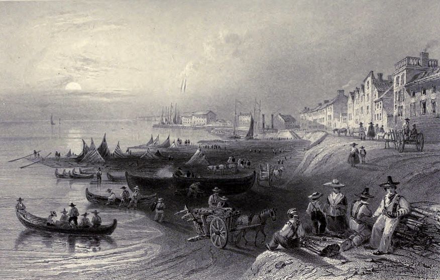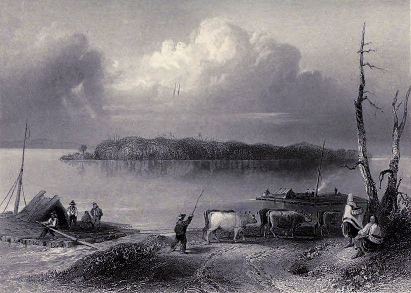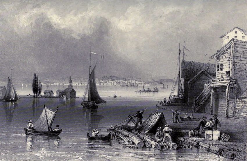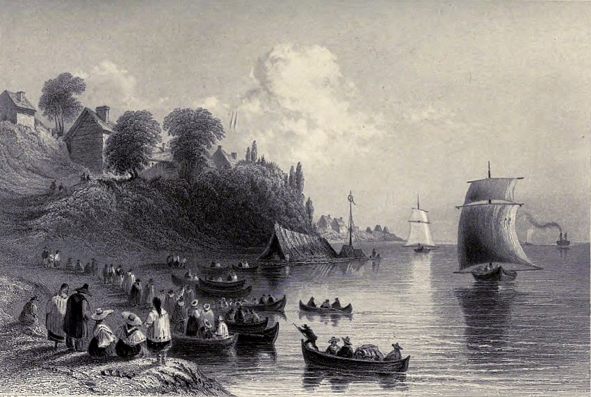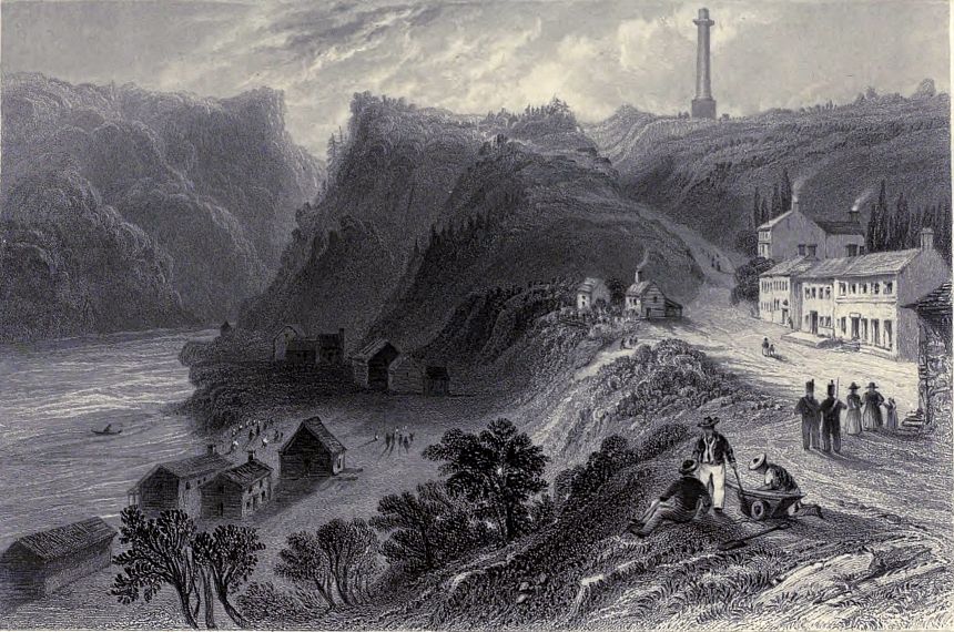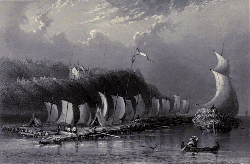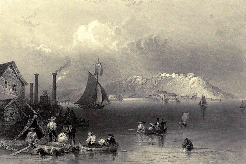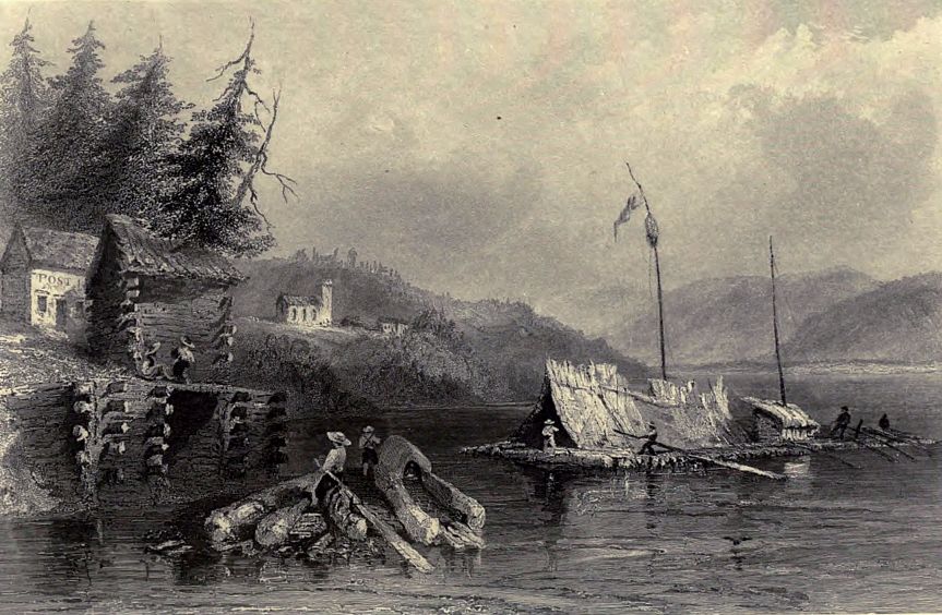About two miles above Quebec, a break in the magnificent line of cliffs forms the little recess, called Wolfe’s Cove; a steep pathway leads up the heights to the Plains of Abraham; traces of field-works are still visible on the turf, and the stone is pointed out on which the hero expired. The cove is at present appropriated to the reception of lumber, which comes down the river from the States and Upper Province, in rafts, which frequently cover the surface of half an acre; when the wind is favourable they spread ten or twelve square sails, at other times they are polled down; the men who navigate them build small wooden houses on them, and thus, transported with their families, poultry, and frequently cattle, form a complete floating village. A great proportion of the timber is brought from Lake Champlain, and the trade is almost wholly in the hands of the Americans.