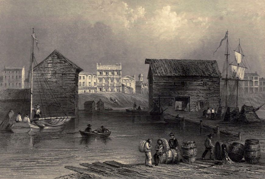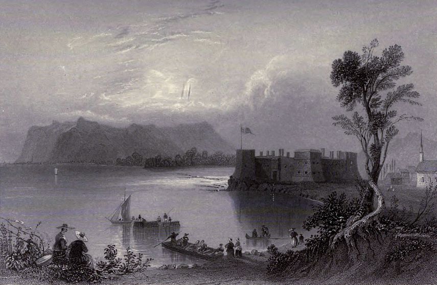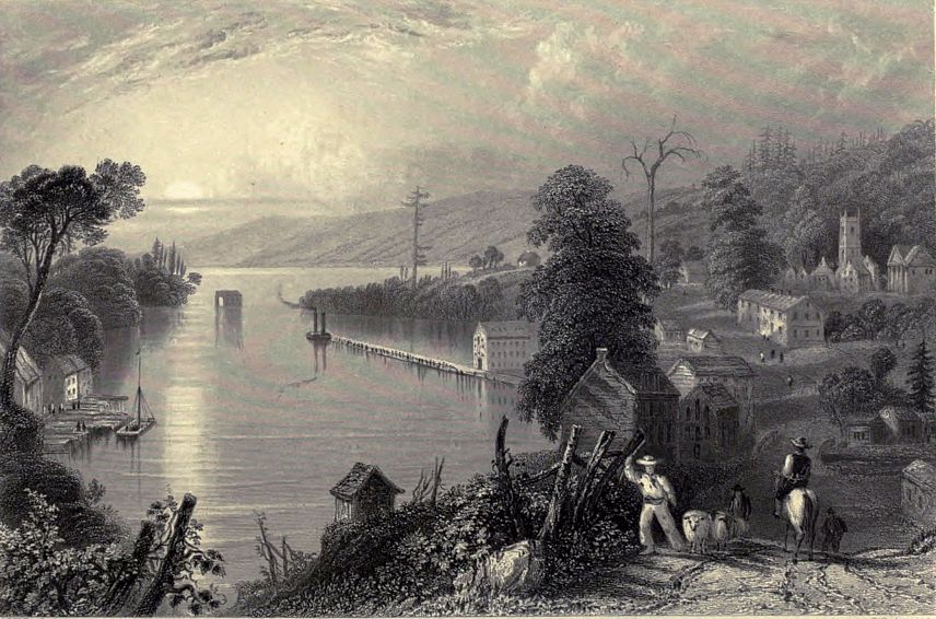 “Soon after I had finished my letter on board the steam-boat, we stopped near the mouth of the Genessee river, to give us the opportunity of seeing Rochester and its vicinity. Stages had been previously sent for, in which we proceeded to Rochester, nine miles distant. On our way we stopped to see the lower falls of the Genessee river, and Carthage bridge. This wooden bridge is now in ruins. When perfect, it must have been extremely beautiful. It was a single arch, whose span was about 350 feet wide, and its extreme height above the surface of the river 196 feet. It gave way from the slightness of its materials, immediately after two children had crossed it. A short distance above it are the falls of the Genessee, which appeared to me to bear a strong resemblance to those of the Clyde. At Rochester we found a handsome mill, and every symptom of a thriving town. Instead of ‘cash store’ being painted over the shops, as in most towns of the United States, to tell the customers that the shopkeepers sell only for cash, while they may almost be induced to sell even a thimble on credit; ‘here cash given for wheat,’ ‘cash given for, &c. &c.’ was the usual motto. We learnt also, that the town was blessed by the absence of a bank, while in the smallest American town I had been accustomed to find banks the first objects which presented themselves—the Farmer’s Bank, the Merchant’s Bank, the Planter’s Bank, the Mechanic’s Bank, the Franklin Bank, the Patriotic Bank, &c. &c. with their various combinations, had met my eye more or less in every village. We embarked again about two o’clock, and in the morning by day-light found ourselves at Sacket’s Harbour, of which we heard so much during the war. It is a noble natural harbour, and the place where the American ships employed on the lakes were built so rapidly. Many of them are now rotting under wooden covers. There is one half finished, said to be longer than our largest ship of the line, covered with a wooden shade, which itself, our conductor told us, cost 7,000l. This immense vessel, so far inland, on the banks of a lake, was a singular sight, and excited some incongruous ideas.