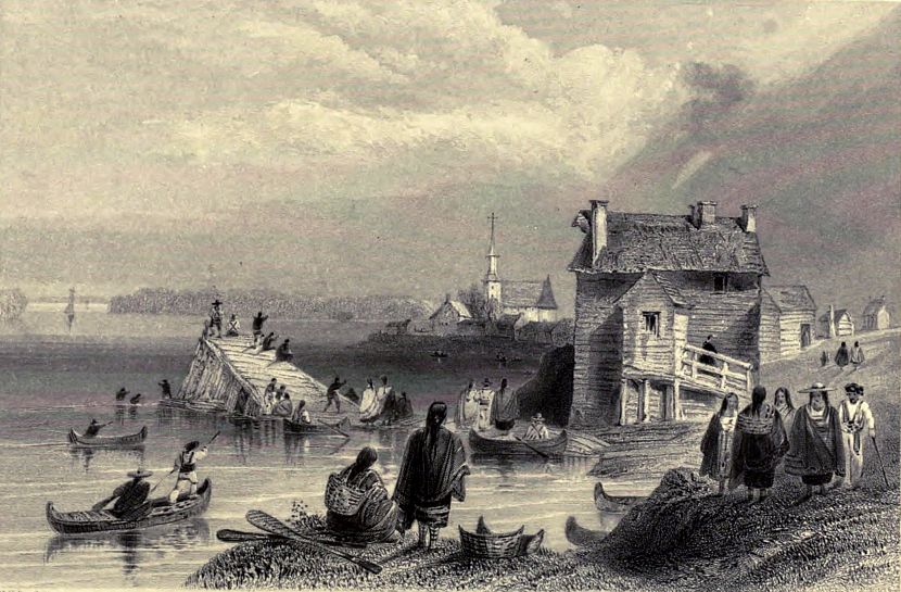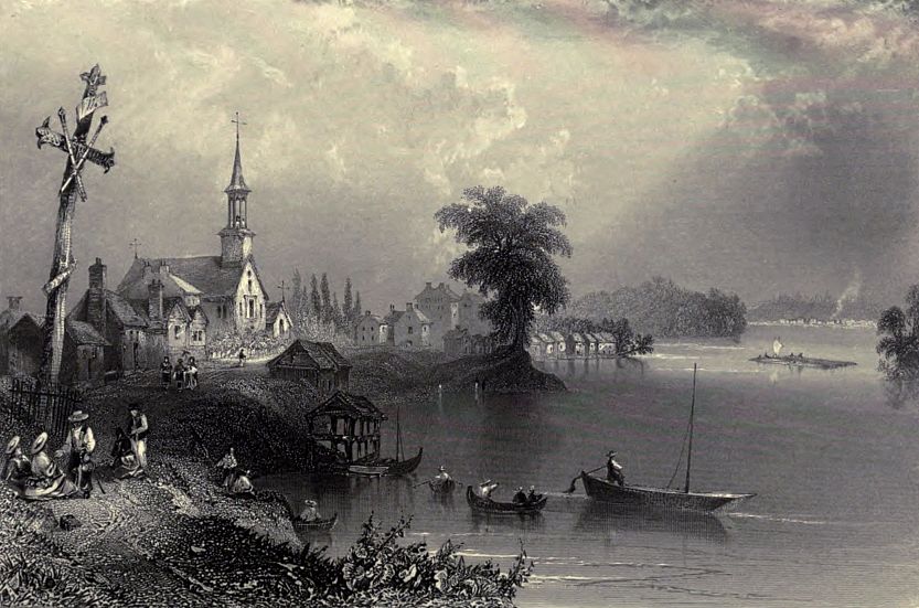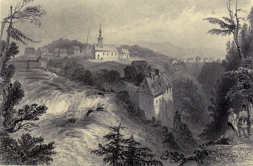 The Huron village of Loretto stands on the left bank of the Charles, about four miles below the lake, (eight from Quebec). The river, immediately on passing the bridge, below the village, rushes down its broken bed of granite, with a descent of about seventy feet, and buries itself in the windings of the deeply-shadowed glen below. A part of the fall is diverted to turn a mill, which seems fearfully suspended above the foaming torrent. The village covers a plot of ground very much in the manner of an English barrack, and altogether the reverse of the straggling Canadian method; it is, in fact, the method of their ancestors. I found the children amusing themselves with little bows and arrows. The houses had generally an air of poverty and slovenliness; that, however, of their principal chief, whom I visited, was neat and comfortable. One of their old men gave me a long account of the manner in which the Jesuits had contrived to trick them out of their seignorial rights, and possession of the grant of land made them by the king of France, which consisted originally of four leagues by one in breadth, from Sillori north. Two leagues of this, which were taken from them by the French government, upon promise of an equivalent, they give up, he said, as lost; but as the property of the Jesuits is at present in the hands of commissioners appointed by our government, they were in hopes of recovering the remainder, which it never could be proved that their ancestor either gave, sold, lent, or in any way alienated.