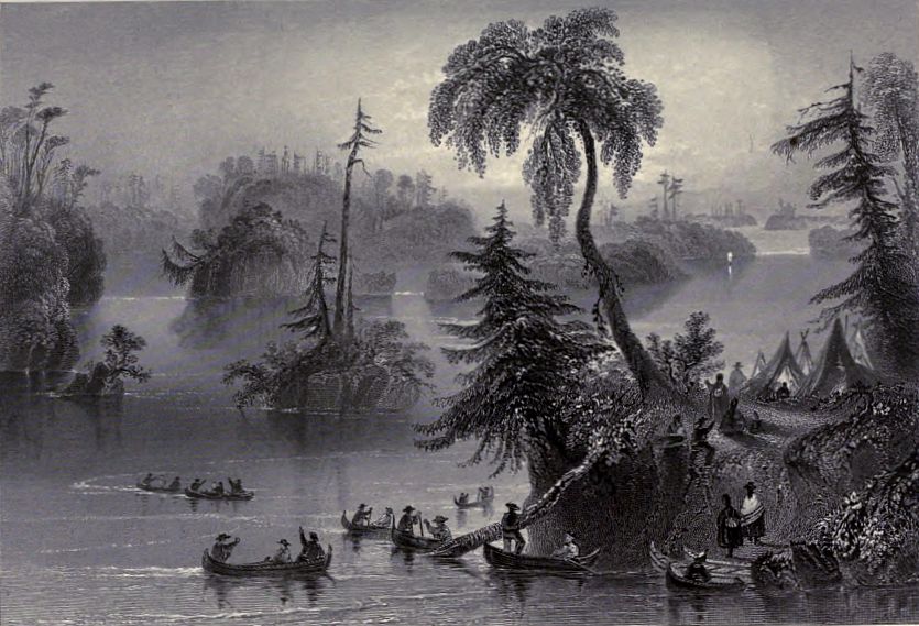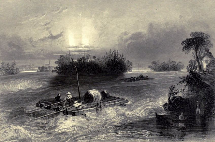 “At Ogdensburgh, which is said to belong principally to Mr. Parish, who is endeavouring to settle a tract of land in the vicinity, we breakfasted at a large stone tavern, which he has built, and then prepared in high spirits to descend the Rapids. For this purpose we hired a long boat, which would accommodate the whole party, and which, with 25 people on board and their baggage, and 25 barrels of flour for ballast, was said to draw only eight inches of water. We set sail about ten o’clock, and in four hours and a few minutes had been carried 48 miles down the stream, in the course of which we had passed the first three rapids, one of which was half a mile, another two, and another about nine miles long. We always discerned them at a great distance, the dashing of the white foam resembling the tossing of the ocean; and as we approached them our velocity gradually increased, till we were carried by the stream at the rate of 14 or 15 miles an hour. When we got into the middle of the surges, our velocity, though still great, was checked by the eddies and by waves which frequently struck the bottom of the boat with great force; and from the appearance of the troubled waters, it seemed difficult for a boat to live. The confidence of the boatmen, however, checked our apprehensions, and our ladies behaved extremely well. The most alarming appearance was that of pointed rocks, which, from the transparency of the water, seemed to rise almost to the surface, and to threaten inevitable destruction. As I stood on the bow, I saw combinations of rocks, towards which we were hurried with impetuosity, and which it seemed impossible our boat could pass without striking. In some of the Rapids there were channels, called lost channels, from the accidents which had happened in them, and into which our boatmen had to guard against our being carried. The river varies from three-fourths of a mile to two miles in width; and although there are no mountains near, (the green mountains of Vermont were often in sight at a distance,) the white pine and cedar gave a picturesque appearance to its banks, and a resemblance to the river views in Norway or Sweden. One of the most singular sensations we experienced, was that of sailing many miles perceptibly down hill. Soon after passing the third rapid, the St. Lawrence expanded into a wide lake—the Lake of St. Francis. There we lost our wind and stream, and were obliged to have recourse to our oars. The evening was now closing in, and a violent thunder-storm brought on a premature darkness; but the ladies enlivened us by singing the Canadian Boat-Song, ‘Row, brothers, row, &c.’ which transported me to ——, where I have so often heard it.
