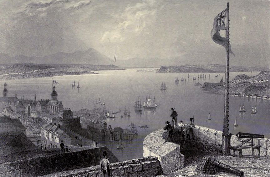 “The town, or rather city, of Quebec, is built on the northern extremity of a narrow strip of high land, which follows the course of the St. Lawrence, for several miles, to its confluence with the Charles. The basis of this height is a dark slate rock, of which most of the buildings in the town are constructed. Cape Diamond terminates the promontory, with a bold precipice towards the St. Lawrence, to which it is nearly perpendicular, at the height of 320 feet. It derives its name from the crystals of quartz found in it, which are so abundant, that, after a shower, the ground glitters with them. The lower town is built round the foot of these heights, without the fortifications, which, with the upper town, occupy their crest in bleak preeminence: the former, snug and dirty, is the abode of thriving commerce, and of most of the lower classes employed about the navy; the latter, cold and lofty, is the seat of government, and principal residence of the military; and claims, in consequence, that kind of superiority which some heads have been said to assert over the inglorious belly. To speak the truth, neither has much to boast on the score either of beauty or convenience.