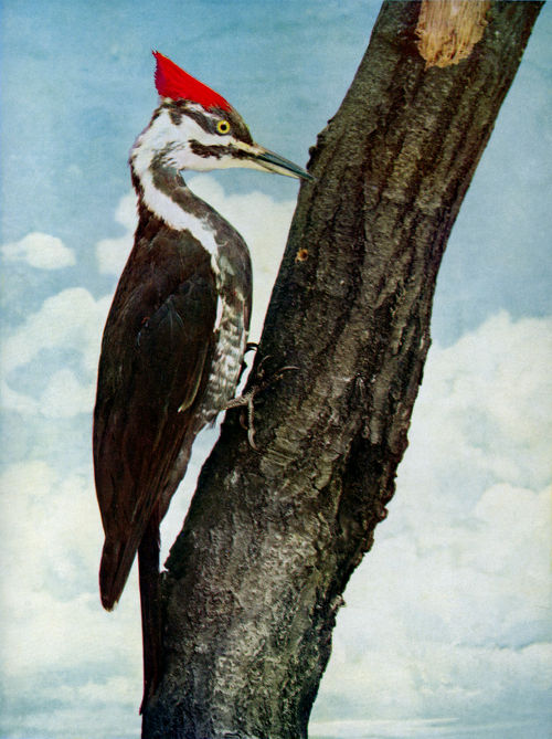 The Pileated Woodpecker is a beautiful bird of great size and strength. Its bill is both large and powerful. In fact, it is exceeded in size by but one of the Woodpeckers—the ivory-billed species—which is a resident of the Southern States. It is quite variable in its habits. In some sections it is very shy and retiring, while in others it is quite tame and becomes quite accustomed to man if not ruthlessly annoyed. Mr. Hardy, writing of his experience with this bird in the woods of Maine, says: “I once had two so tame they would allow me to sit within four paces of them, and put my hand upon the tree when they were not ten feet above my head.” Mr. Chapman, writing of its habits in the cypress swamps of Florida, says: “There, contrary to the experience of Audubon, I found it by no means a wild bird. Indeed, flickers were more difficult to approach,” and he also writes: “I have called these birds to me by simply clapping my slightly closed palms, making a sound in imitation of their tapping on a resonant limb.” Another writer states that when called in this manner, “they seem to lose their usual shyness and seem stupefied at not finding their mate, as they had expected.”