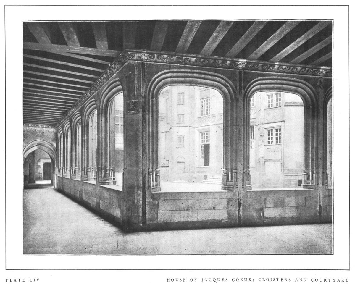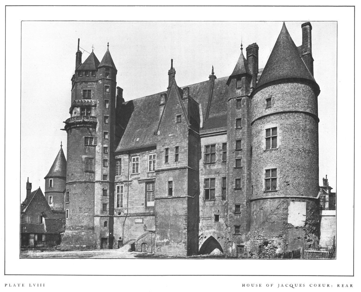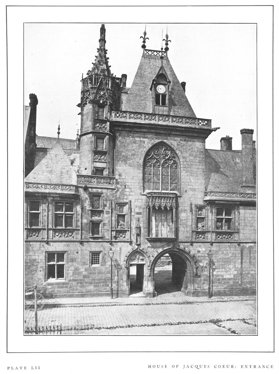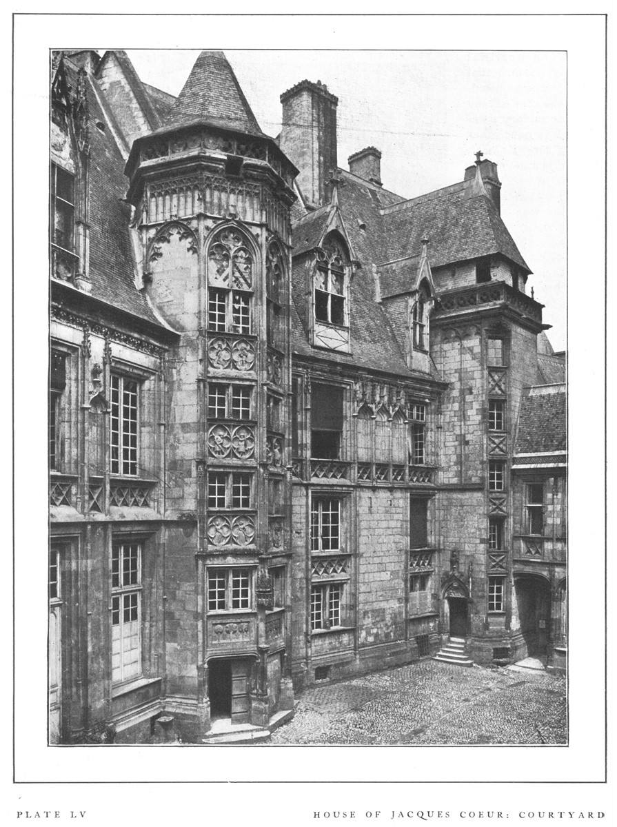 As has been said, Jacques Cœur's most princely residence, that at Bourges, was begun in 1443, when he was at the height of his prosperity, and was nearly completed when in 1451 his downfall came. In spite of changes in the arrangement of the interior, in spite of a clumsy addition in the Renaissance style on the right of the courtyard, and in spite of some blunders in the restoration, which was undertaken by the government in 1858, the building has escaped any grave mutilation, and may be taken as a type of the princely residence of its century.