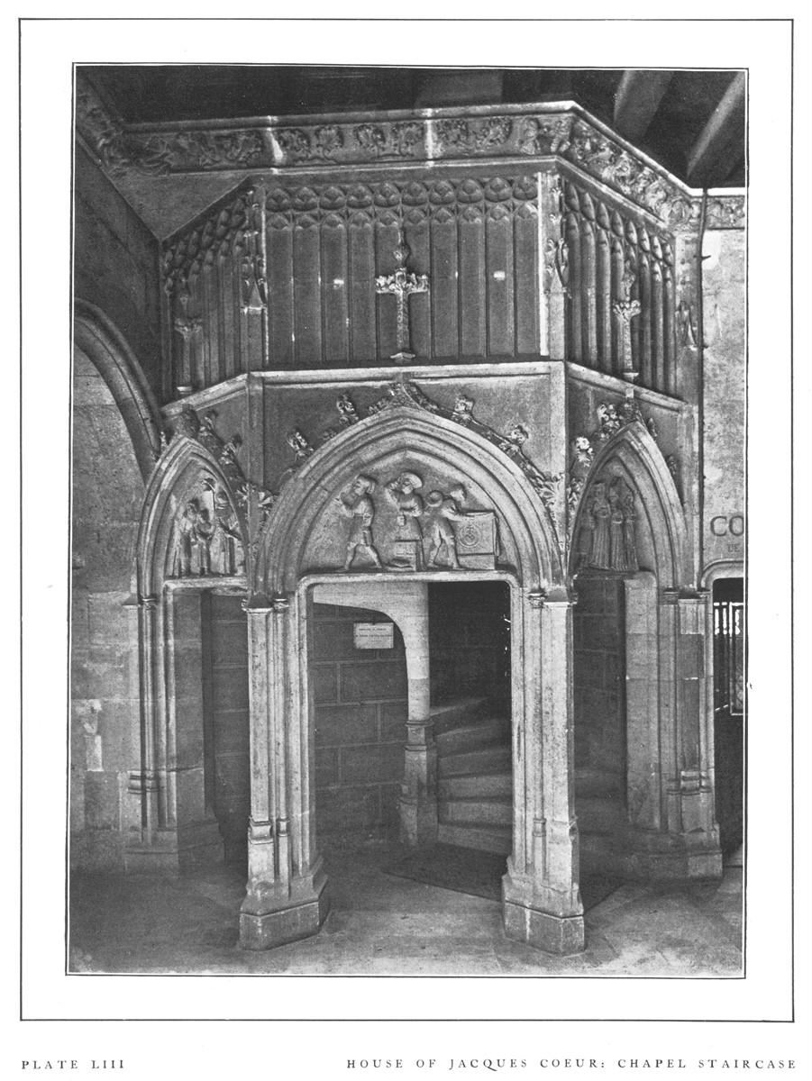 The façade of the house (Plate LI.) faces a small square in which stands a modern statue of Jacques Cœur. The main feature of this façade is a central pavilion (Plate LII.) which contains the main portal of the house comprising two entrances, the larger for horsemen and guests, the smaller for tradesmen and servants. Above the portal is a niche sheltered by a carved canopy, wherein an equestrian statue of Charles VII. originally stood. The niche is flanked by two false windows, and out of each leans a stone figure, one representing a man-servant, the other a maid-servant, both dressed in the costumes of the time, who peer out into the street as if to watch for the return of their lord. On the left of the pavilion rises a beautifully elaborated prism-shaped tower, within which winds a spiral staircase leading to a chapel. This chapel occupies nearly the whole of the first story of the front, and a great window that lights it opens above the entrance.