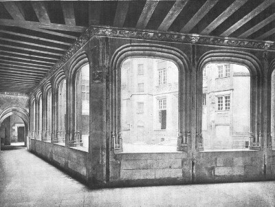 The principal side of the court, architecturally considered, is opposite the main entrance (Plate LV.). The chief feature of this side is a great octagonal tower which contains the stairway leading to a dining-hall situated on the first floor and corresponding in position to the chapel in the front wing. The north and west sides of the courtyard are surrounded, on the ground floor, by cloisters (Plate LIV.) above which were the living-rooms and household offices.