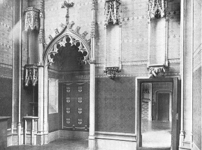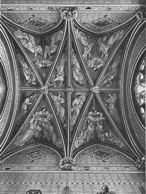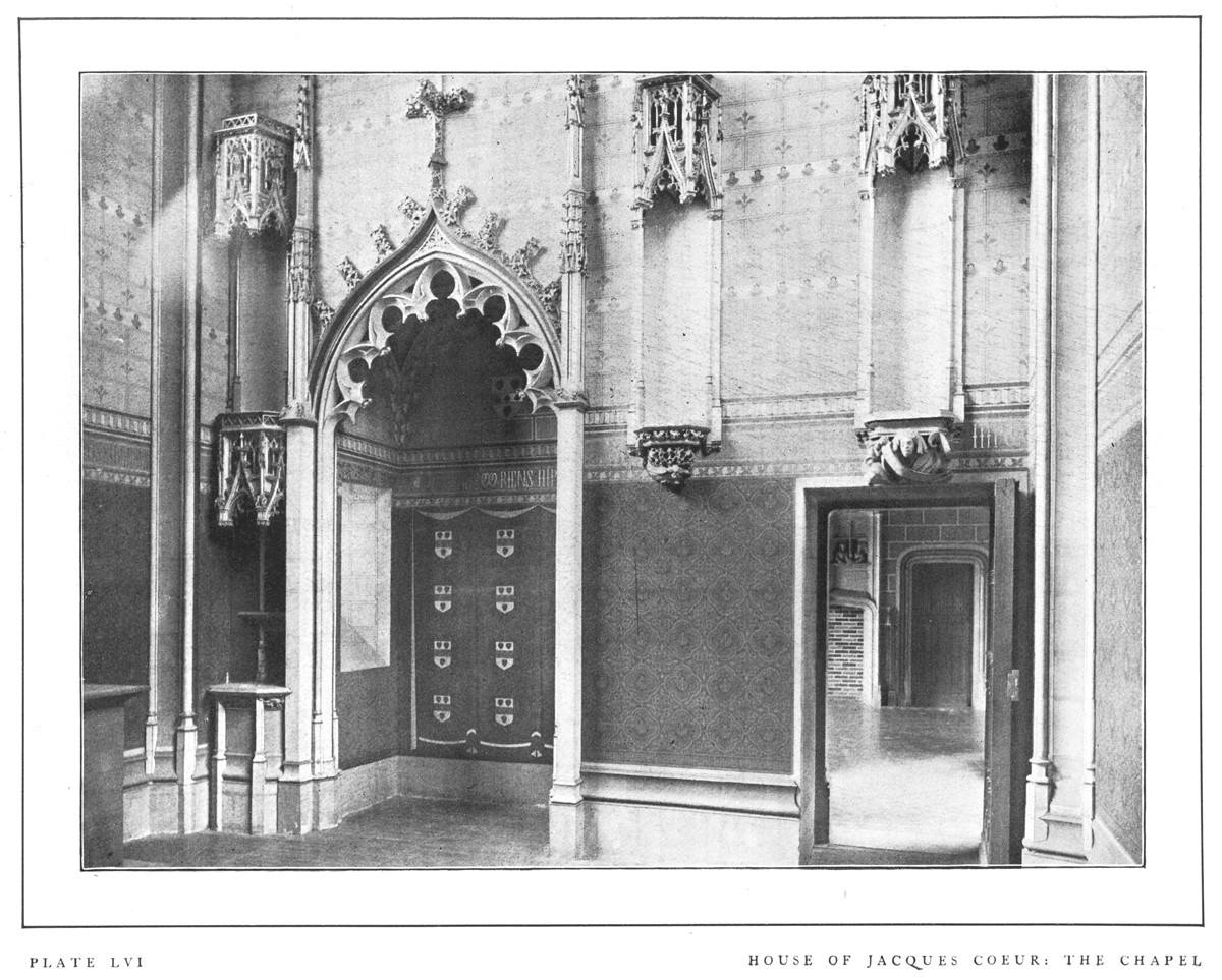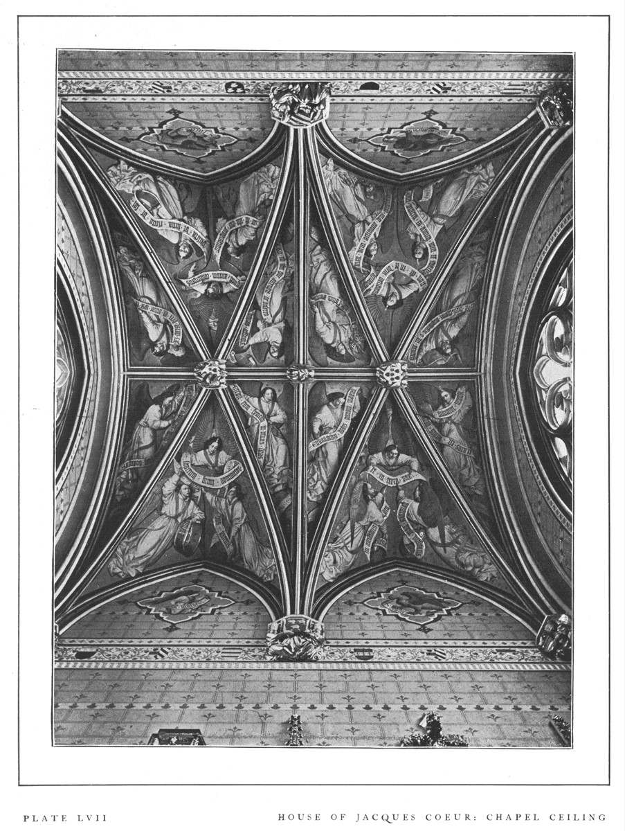 The only room of architectural interest in the interior, which has been largely remodelled to serve the various public uses to which the building has since been put, is the chapel (Plates LVI. and LVII.). Here the side walls have suffered from too ardent restoration; but the splendid painted ceiling is intact. It is divided by ribs, the bosses of which are decorated with the arms of Jacques Cœur and those of his wife, into twelve triangles, four large and eight small ones; and within these triangles, relieved against a background of gold-starred blue, angels bearing ribbons inscribed with scriptural texts are painted. The breadth and beauty of the design, the sobriety and harmony of the color-scheme and the excellence of execution gives this ceiling first importance as a document in the history of French decorative painting.