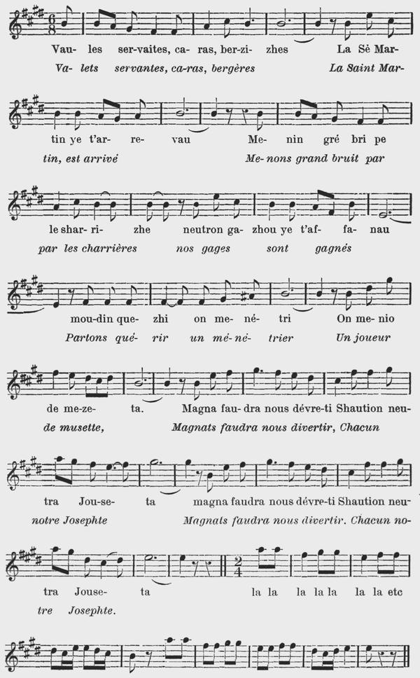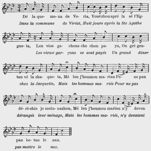 La partie de chant est l'œuvre d'un ami, pur Bressan aussi, M. de la Girodière, qui a bien voulu, sur ma demande se charger de noter ces chansons telles qu'elles se chantent dans nos campagnes, sans-souci des règles musicales.