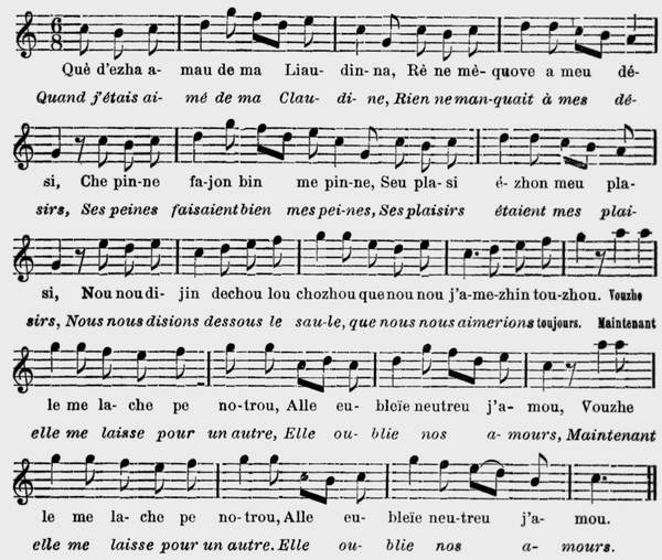 1 Què d'ezha amau de ma Liaudinna, Rè ne mèquove a meu dési, Che pinne fajon bin me pinne, Seu plasi ézhon meu plasi, Nou nou dijin dechou lou chozhou Que nou nou j'amezhin touzhou. Vouzhe le me lache pe notrou, Alle eubleïe neutreu j'amou. |