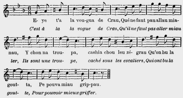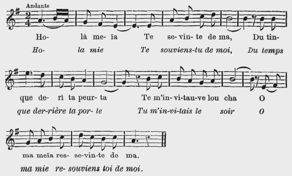 4 Dé mon tourmé pe va ma blonde L'a sheurshezha sè m'arrétau. Pe lamè mamau cha man blanshe De baillezha bin mon grè prau, De l'amou tè que rè su tarra Ne vaut pre ma che n'amitia, Pe la va d'azardezha me n'ama Pe l'a va de vèdra ma via. |