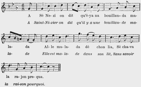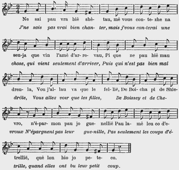 2 Tui leu matin dè la preleia Nou menovin neutreu moton, Me chetova prè de ma meïa, Nou quemèchovin na shèchon, Pi aprè cètië nou dèchovon E nou teniè tui deu la mon, De plasi leu moton chotauvon Mè le ne vin pau mé è shon. |