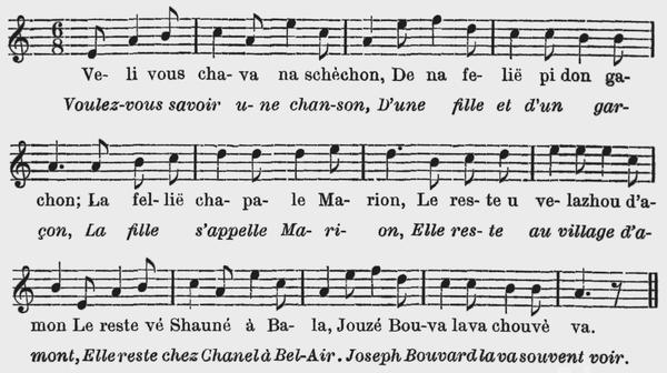 Il y a deux sons cependant qui rendent l'écriture du patois fort difficile parce qu'ils n'existent pas dans la langue française—Pour faciliter la lecture j'ai toujours représenté par «sh» celui que l'ont produit en appuyant la langue contre les dents supérieures et en sifflant comme pour prononcer s., et par «zh» celui que l'on produit en appuyant la langue de la même façon et en sifflant comme pour prononcer z.