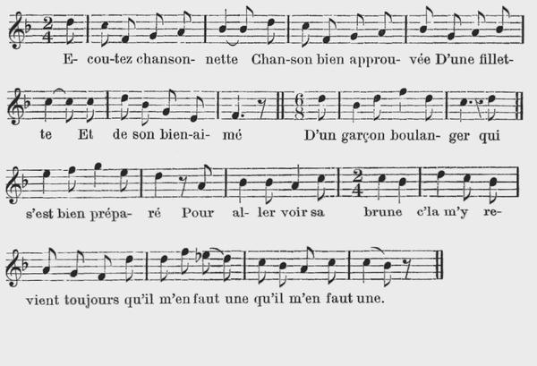 711 Écoutez chansonnette Chanson bien approuvée D'une fillette Et de son bien-aimé D'un garçon boulanger Qui s'est bien préparé Pour aller voir sa brune C'la m'y revient toujours Qu'il m'en faut une. (bis) |