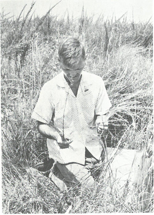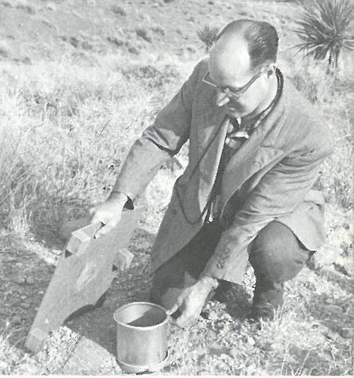 DESERT. Zoologist examines an animal trap as part of a field ecological study of a Nevada nuclear test site.