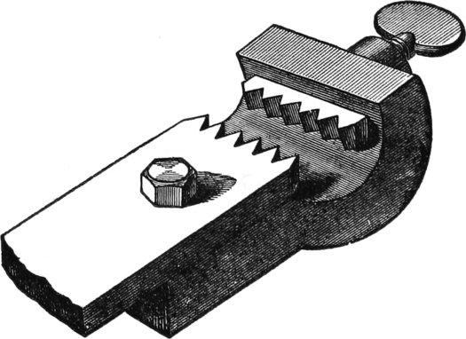 It is not necessary to mention what kinds of work can be done, for that will occur to every one, but I will merely give here an illustration of the facility which the chuck affords for all kinds of work. Fig. 57 is a box cover, and being held at first by the corners, permits the inside to be turned out to fit the bottom. Afterwards, whatever finish or pattern is desired, can be given to the top. There is in every lathe, a center screw, like Fig. 58, which is useful for holding work that has, or is to have, a hole in it, but for fine work it is not suitable, for the obvious reason that the screw spoils it. Fig. 57 is the scroll chuck, and is a favorite instrument of mine. I could dispense with many things—the face-plate of the lathe for one—better than I could with this. If I want to make a sleeve-button, there is my friend, the scroll chuck, ready to hold the piece true to the center, without any adjustment whatever and hold it firmly, too. If I wish to bore out a ring, the chuck will grasp true, and hold it without spring: in fact, not to dilate unnecessarily, I call it the one thing no turner can afford to be without. There are many in the market, but the best one for general work of this class, I have found to be that made by A. F. Cushman, of Hartford, Connecticut. He makes a very small chuck, also, for holding drills, that is exceedingly convenient for them, and for holding screw wire, or any work of that class. The “Beach Chuck,” made by the Morse Twist Drill Company of New Bedford, Massachusetts, is also a good chuck, but as I am not now discussing the merits of chucks, I will return to the subject in hand—treatment of woods.