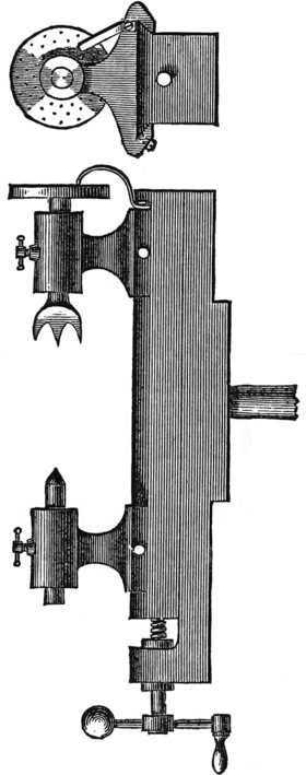 There is no family in this country that would not find it economy to have a foot lathe in the house, where the members have mechanical tastes—not necessarily the male members, for ladies use foot lathes, in Europe, with the greatest dexterity. Some of the most beautiful work ever made, was by Miss Holtzapfel, a relative of the celebrated mechanist of the same name. If there are shovels to be mended, the lathe will drill the holes and turn the rivets. If the handle of the saucepan is loose, it will do the same. If scissors or knives want grinding, there is the lathe; if the castors on the sofa break down, there is the lathe; if skates need repairs, either of grinding or of any other kind, there is the lathe. In short, it ought to be as much a part of domestic economy as the sewing machine, for it takes the odd stitches in the mechanical department that save money.
