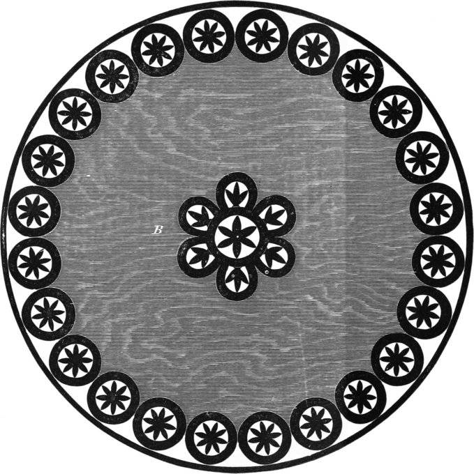 Fig. 77 is still another pattern, but what is shown dark, as at A, in the outer circles should be light to represent tulip wood. Tulip contrasts splendidly with ebony. The center or body of the cover should be rosewood. This must be put on first, all over the whole surface, and a white holly ring put on the outside edge. The exterior and interior circles, which form the pattern, are then cut out by a tool like a carpenter’s bit used in the lathe, as in this diagram. The letter a is round, and will, of course, make a slight center hole in the box cover, but as it is covered up that is a matter of no moment. The inner circles B should also be tulip, or some wood that contrasts with ebony; mahogany is very handsome. This pattern is not pretty, but it is striking and unique, which is sometimes the same thing. Of course, the distances of the circles must be determined beforehand with a pair of compasses.