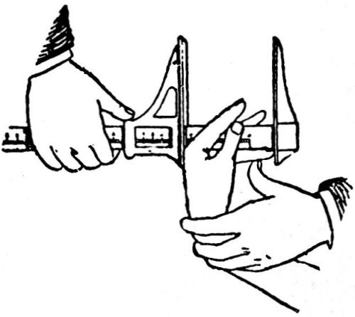 The system embraces three distinct parts: First, the measurement of certain unchangeable “bony lengths” of the body; second, a careful description of the features of the face; third, a careful localization of all scars and marks on the body. While the face may change, be even mutilated beyond recognition; while the scars and other marks may be removed, the “bony lengths” of the body remain unchangeable in adults. The parts measured of the bony lengths of the body are the length and width of the head, the cheek width, length of foot, the middle and little finger and the cubit, i. e., from the elbow to the tip of the little finger; the height standing, the height seated, the reach of outstretched arms, right ear length (which most authorities assert remains the same through life), the median line in front from the fork or hollow below the “Adam's apple” down, and, in the rear, the spinal column from the seventh vertebra to the base of the spine, are the anatomical or “guiding [pg 13] points” from which all descriptions of the body are recorded; in the fingers, the joints and flanges,—the flanges being the portions of the fingers between the joints. The calipers for measuring the head are provided with a graduated arch and are similar to a compass. In taking the length of the head the left point of the caliper is held at the root of the nose and the right point is brought against the occipital bone in the back of the head; the thumb screw is then tightened and the measurement checked by passing the instrument again over the head. The width of the head over the cheeks is taken in the same way. The measurement of the foot is taken with a caliper rule similar to that used by a shoemaker; the prisoner is posed standing on his left foot and steadying himself as shown in the illustration. The graduate stem is placed against the inside of the foot with the fixed arm in contact with the heel and the sliding arm then brought in tightly against the toe. In measuring the left middle [pg 14] and little finger the back of the caliper rule is used, two small projections being provided on the fixed and sliding arms. The finger is bent at right angles to the back of the hand and the measurement taken from the tip of the finger to the knuckle.