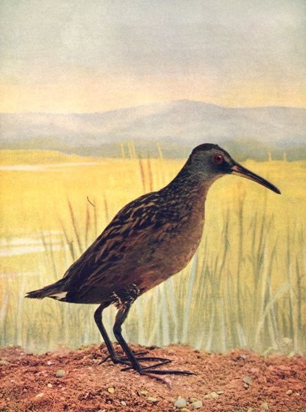 THIS miniature of Rallus elegans or king rail, is found throughout the whole of temperate North America as far as the British Provinces, south to Guatemala and Cuba, and winters almost to the northern limit of its range. A specimen was sent by Major Bendire to the National Museum from Walla Walla, Wash., which was taken Jan. 16, 1879, when the snow was more than a foot deep. Other names of the species are: Lesser clapper rail, little red rail, and fresh-water mud hen. The male and female are like small king rails, are streaked with dark-brown and yellowish olive above, have reddish chestnut wing coverts, are plain brown on top of head and back of neck, have a white eyebrow, white throat, breast and sides bright rufous; the flanks, wing linings and under tail coverts are broadly barred with dark brown and white; eyes red.
